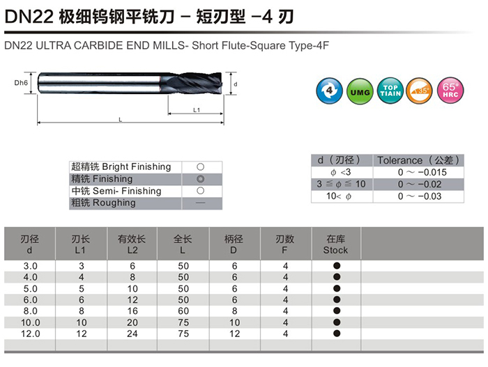DN22極細(xì)鎢鋼平銑刀-短刃型-4刃